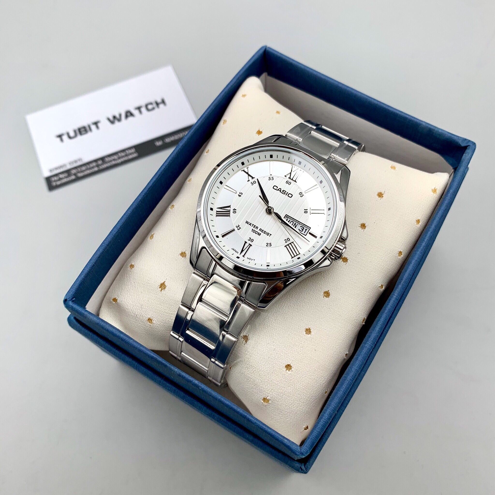 Phụ kiện đi kèm gồm hộp và thẻ bảo hành 10 năm cho máy , 10 năm cho chống nước và thay pin miễn phí trọn đời.