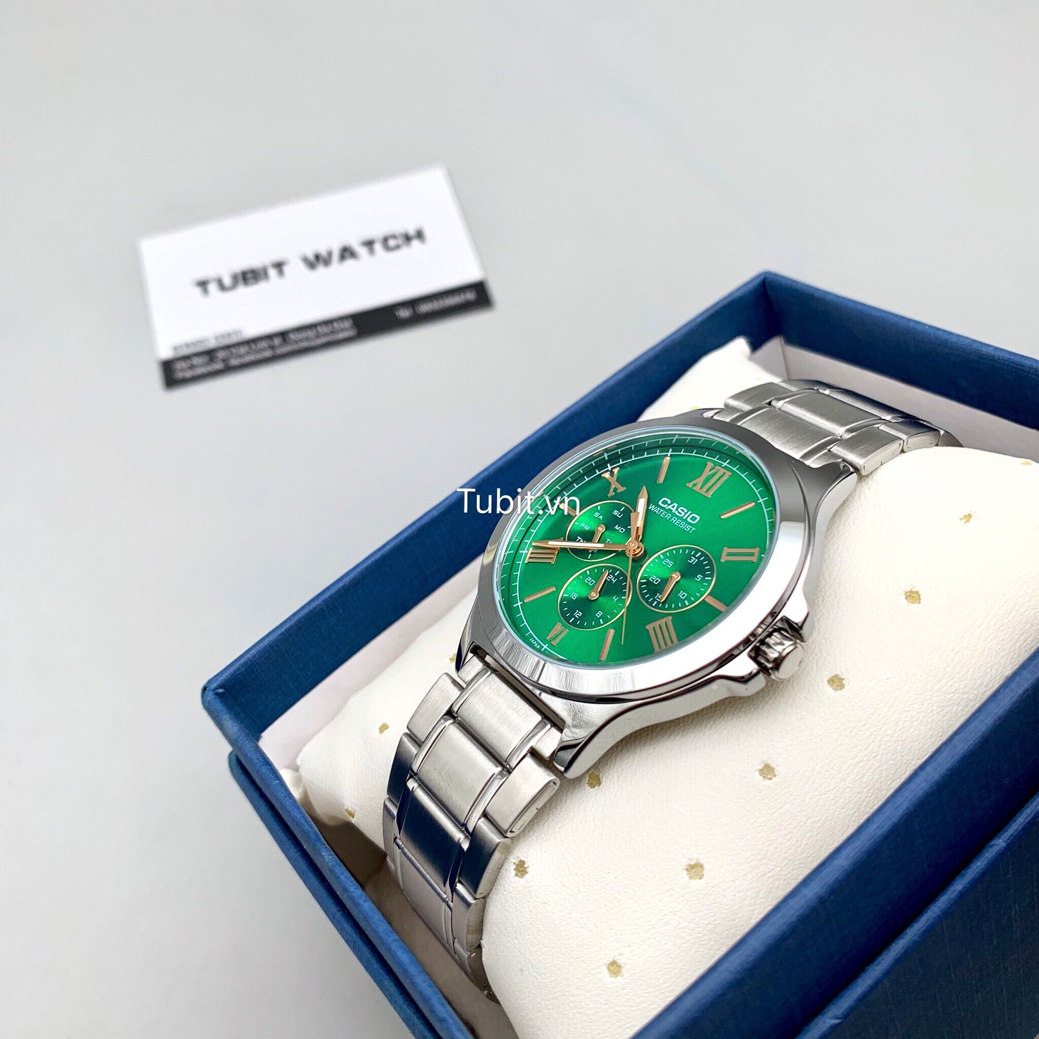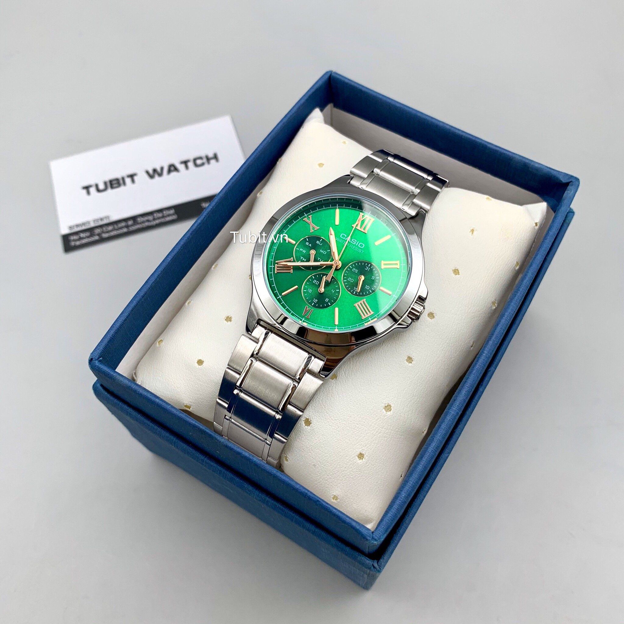 Phụ kiện đi kèm gồm hộp và thẻ bảo hành 10 năm cho máy , 10 năm cho chống nước và thay pin miễn phí trọn đời.