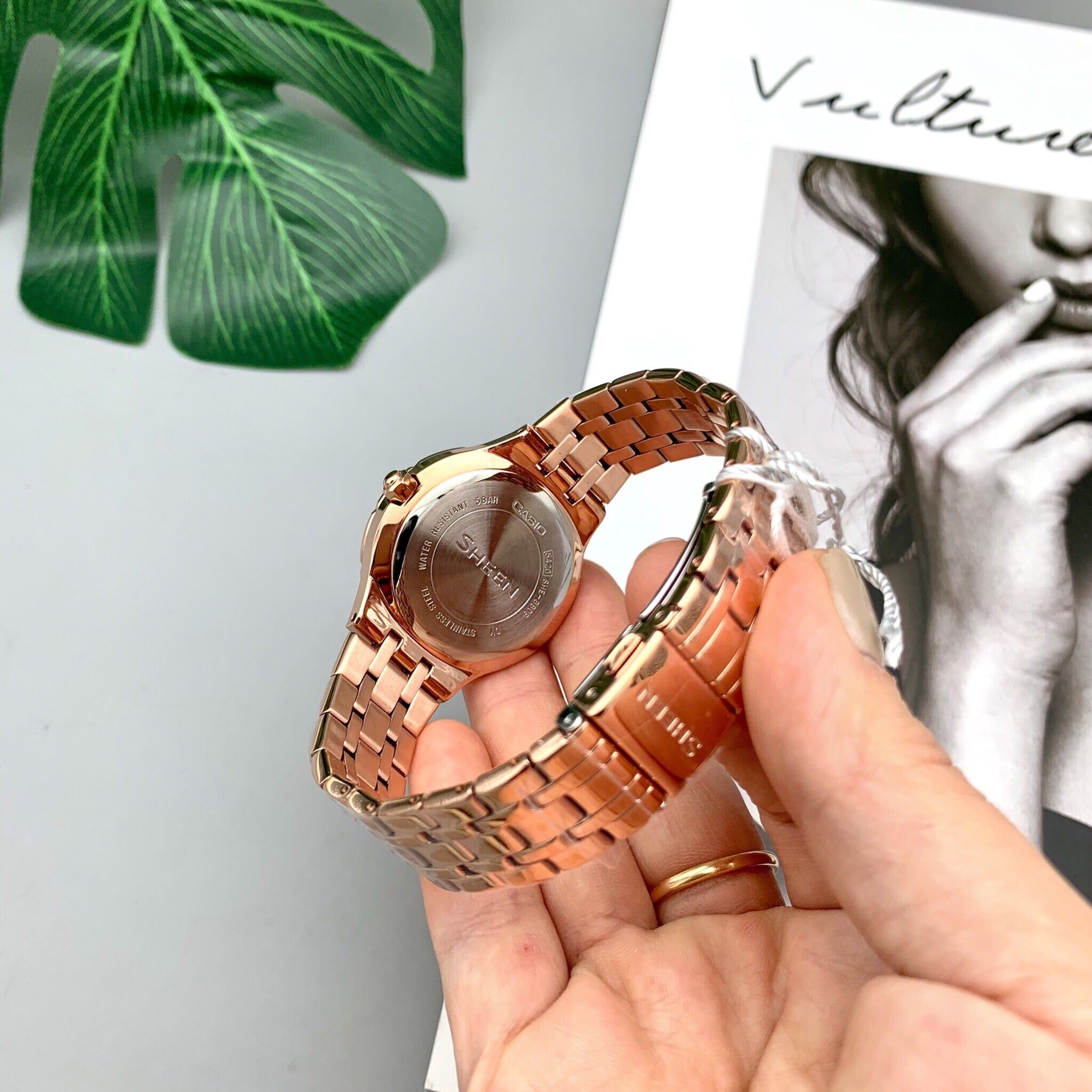 - Vỏ và dây đeo mạ ion màu vàng hồng