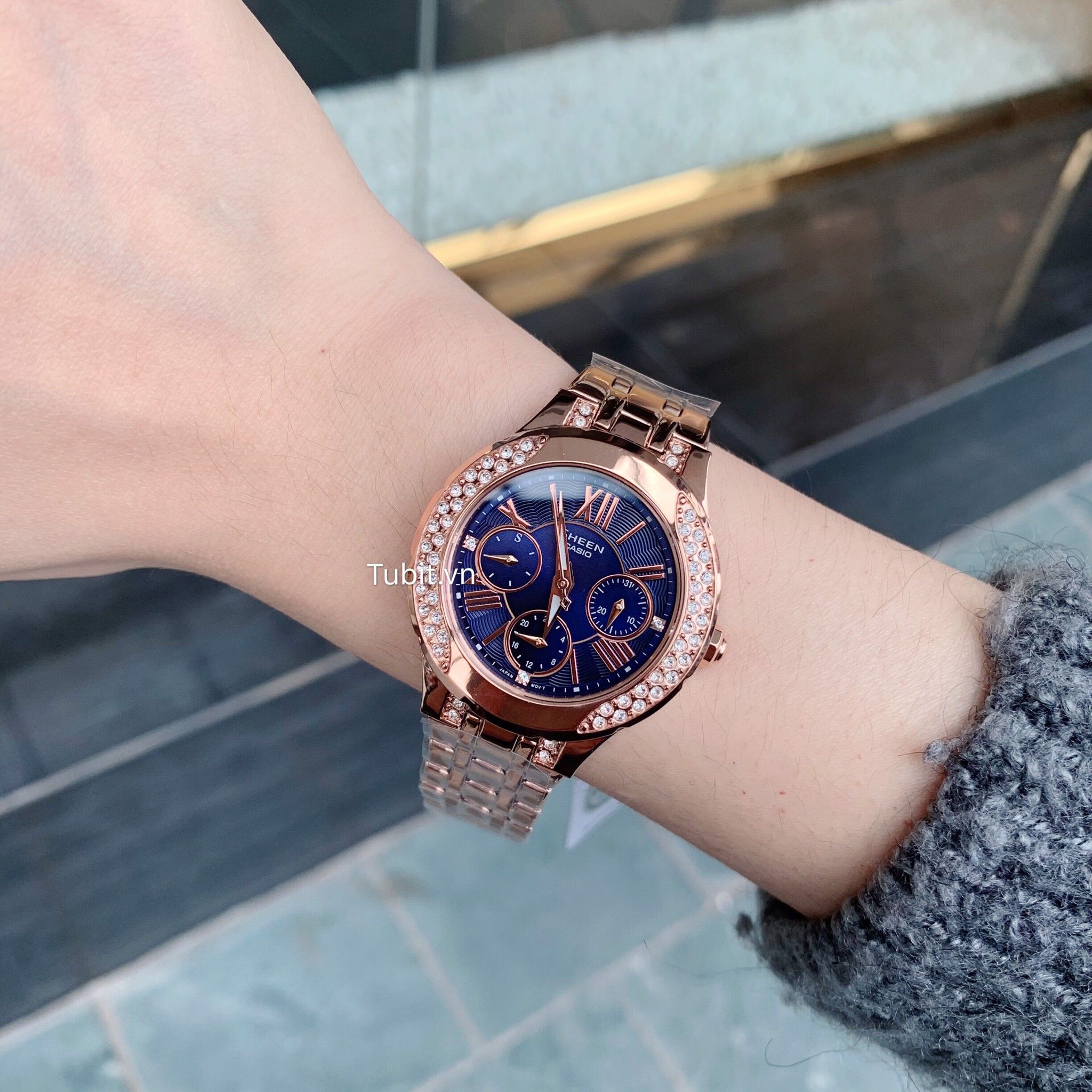 - Pha lê Swarovski® lấp lánh trên gờ và vạch giờ