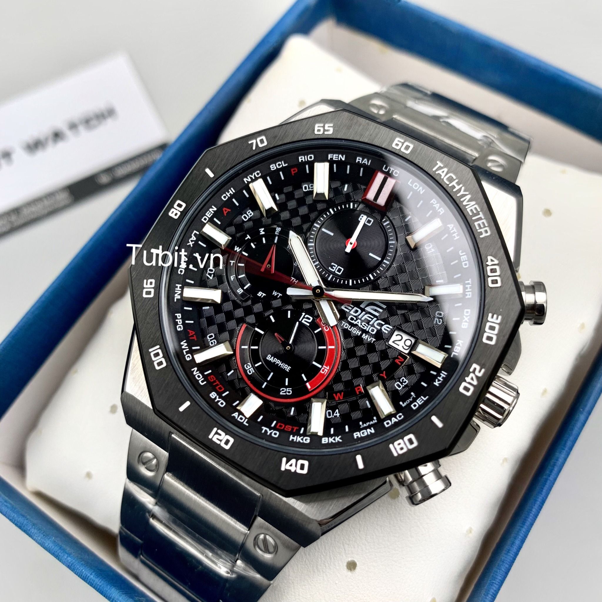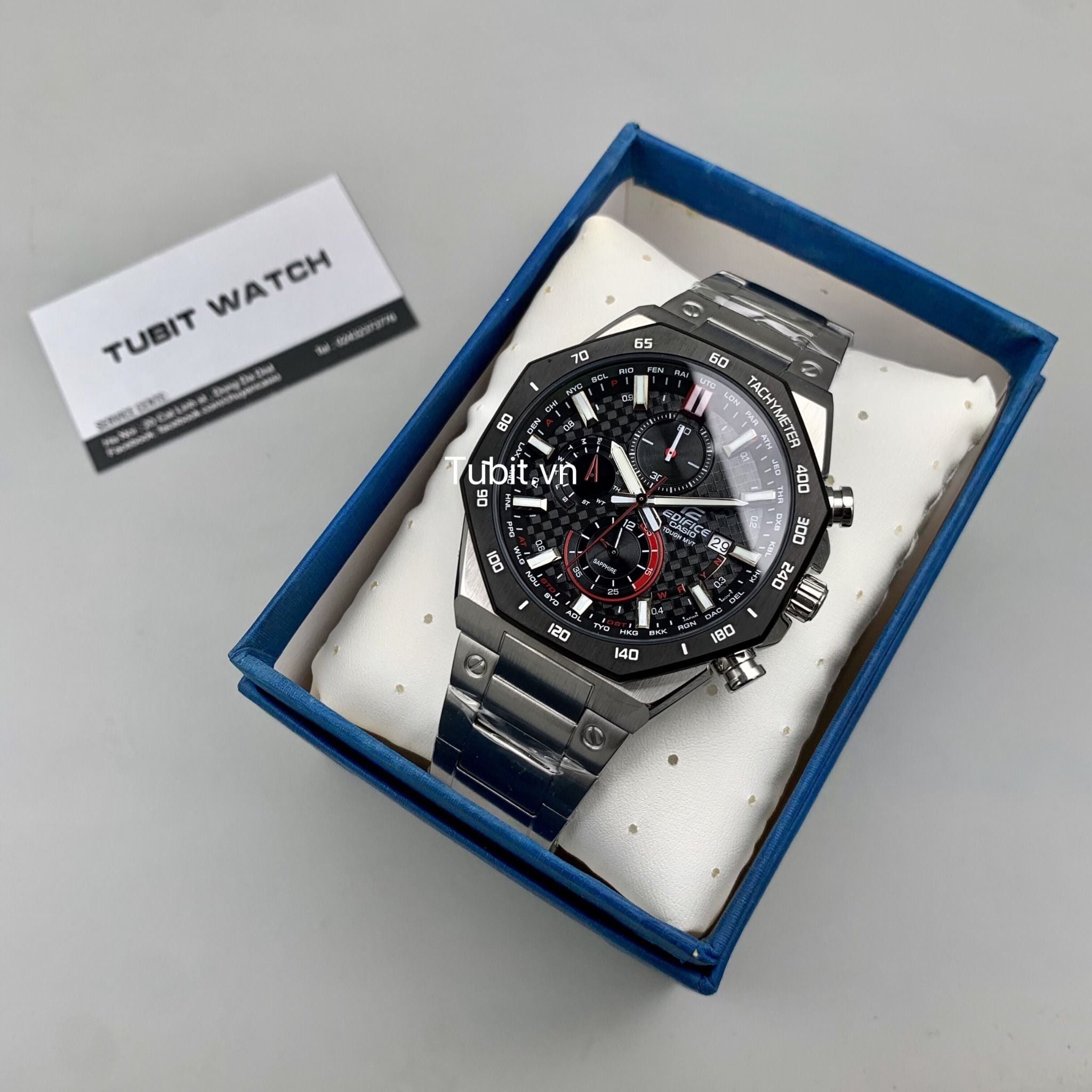 Bộ sản phẩm fullbox gồm hộp và thẻ bảo hành 10 năm cho máy , 10 năm cho chống nước và thay pin miễn phí trọn đời.